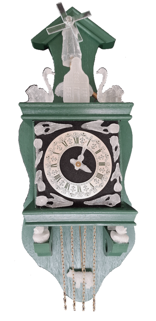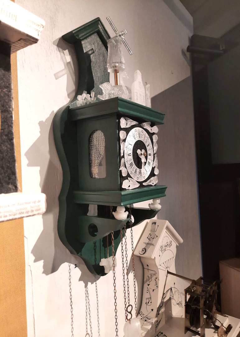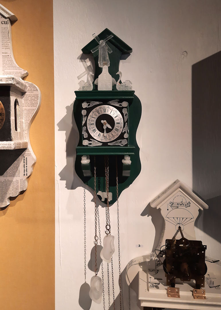 Een klok is een instrument dat de tijd in meetbare eenheden verdeelt en daarmee het ongrijpbare zichtbaar maakt. De Zaanse Schans is bovendien een plek waar het verleden nog voelbaar aanwezig is. Met deze bewerkte klok wil ik een beeld oproepen van het verleden van de Zaanstreek. Daarbij spelen typisch Zaanse kleuren en glazen objecten een belangrijke rol.